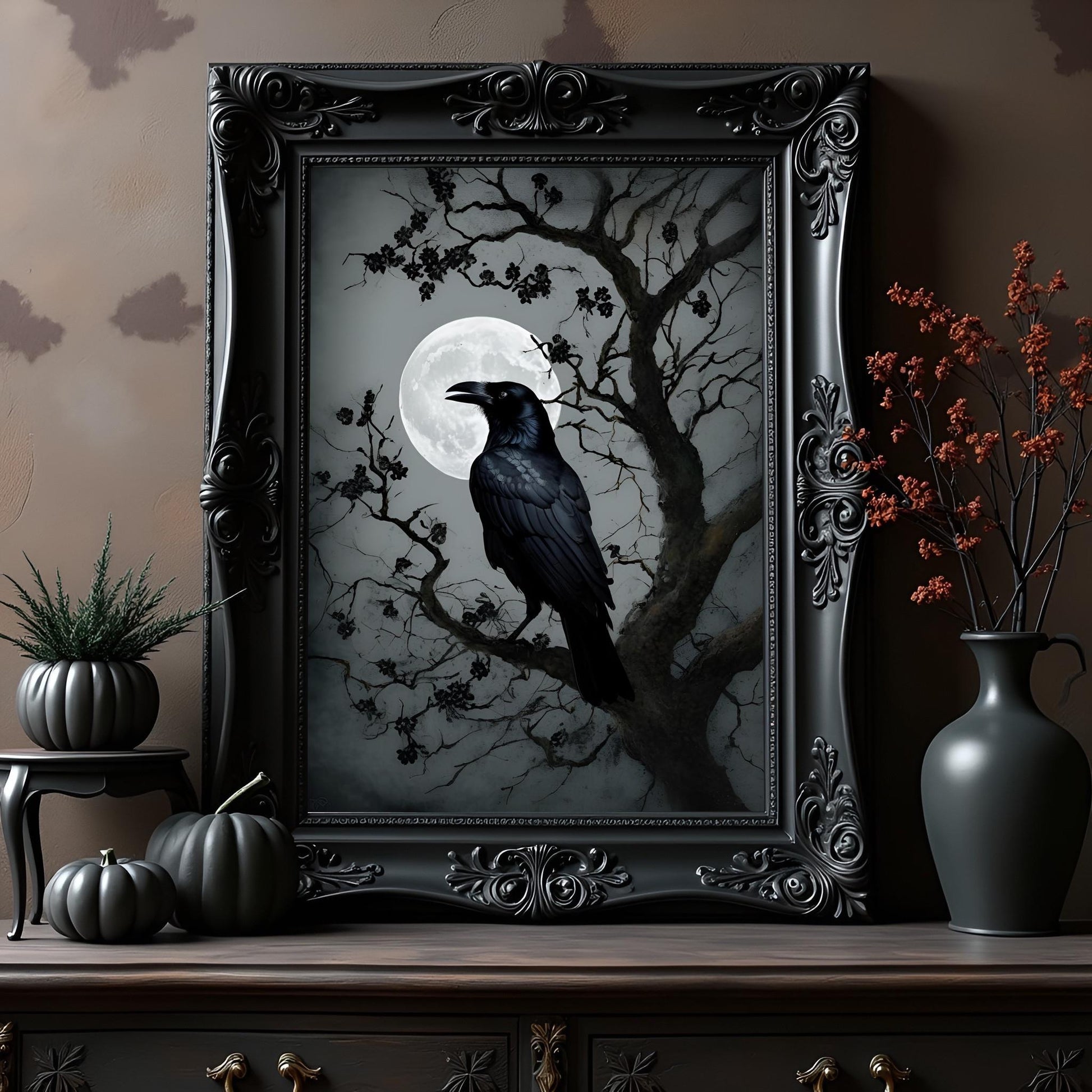 Black Crow Moon Art Print: Gothic Wall Hanging