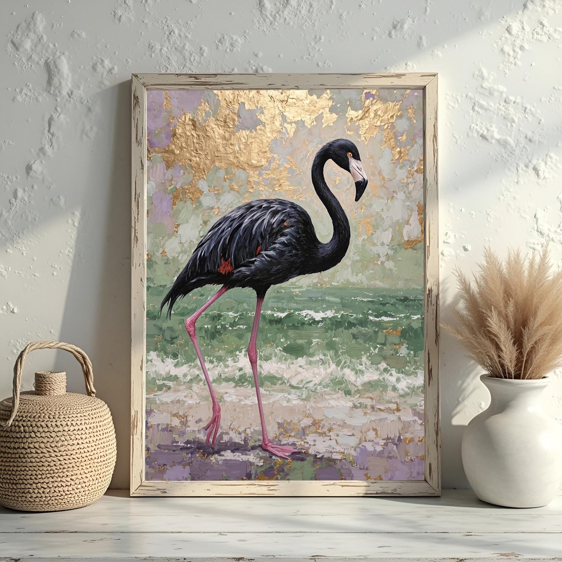 Transform your space with this striking black flamingo abstract art print, where tropical elegance meets bold contemporary design. Rich purple, sea green, and shimmering gold tones create a captivating focal point that brings sophisticated coastal energy to any room.
