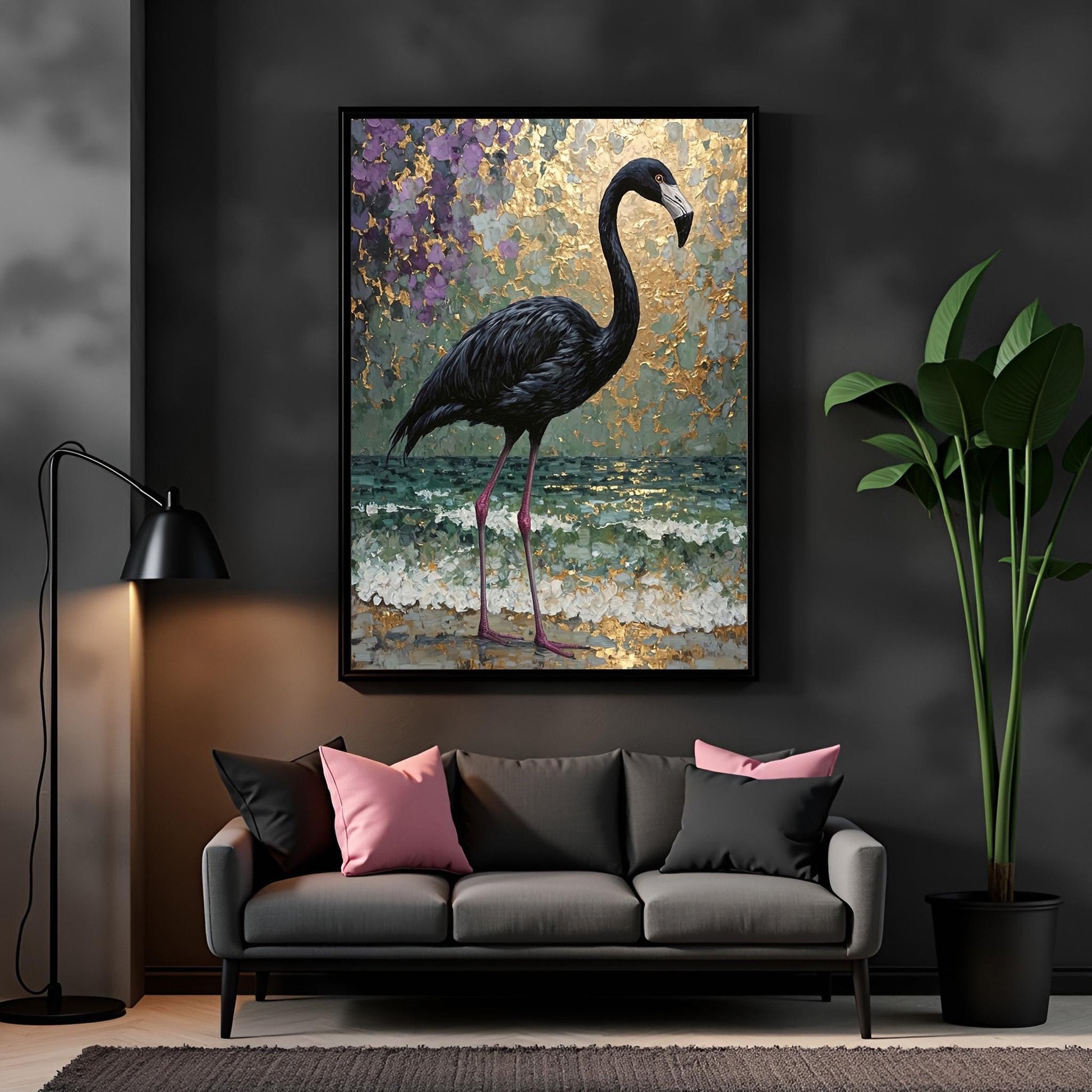 This isn't your typical pink flamingo—our abstract black flamingo walks along sun-drenched shores in a dreamy palette of purple, green, and gold. Perfect for anyone who loves coastal living with an edge, this Florida-inspired piece captures the magic of tropical beaches with an unexpected twist.