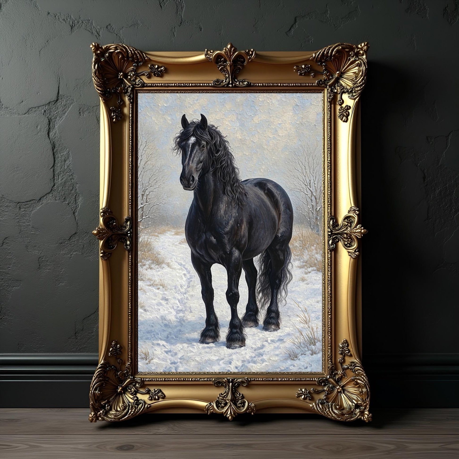 Black Horse Portrait Art Print: Winter Snow Scene For Horse Lovers