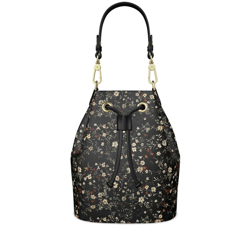 Adorable bucket handbag showcasing dainty flowers  in shades of red and pale yellow on a dark textured background. This casual bag features a leather draw cord, and your choice of grab handle or shoulder strap. Perfect for a day trip with friends, or an evening out on the town.