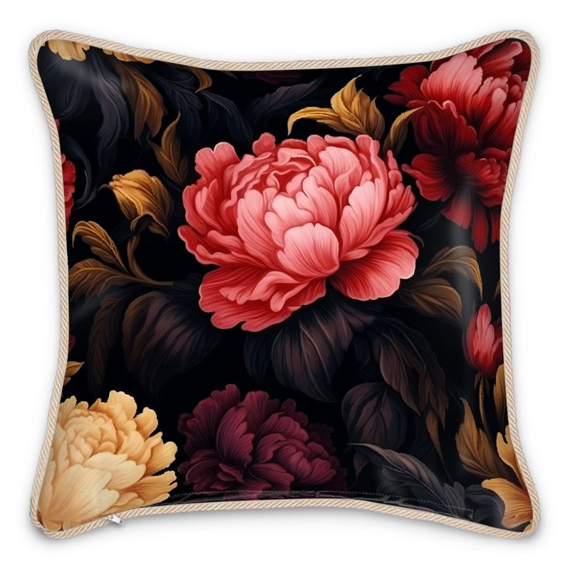 Exquisite home accents should never be underrated, and this Gothic floral silk pillow cover is no exception. This pillow cover boasts a lovely double sided floral print in shades of red, violet, green, and cream. Luxurious 100% silk pillow cover with cream colored braided trim in 3 sizes to choose from is the perfect finishing touch for couch, bed, or office. An absolutely beautiful addition to your home.