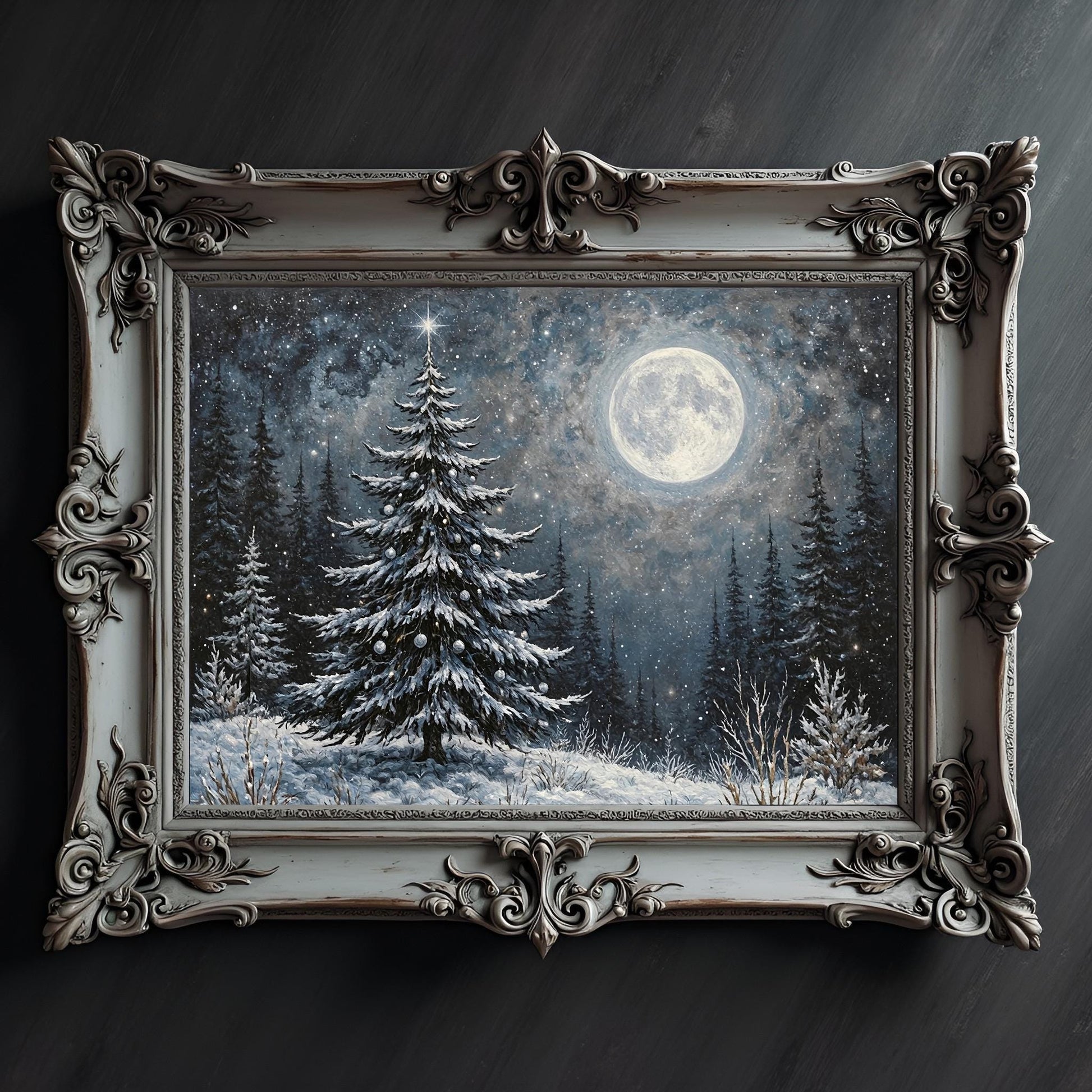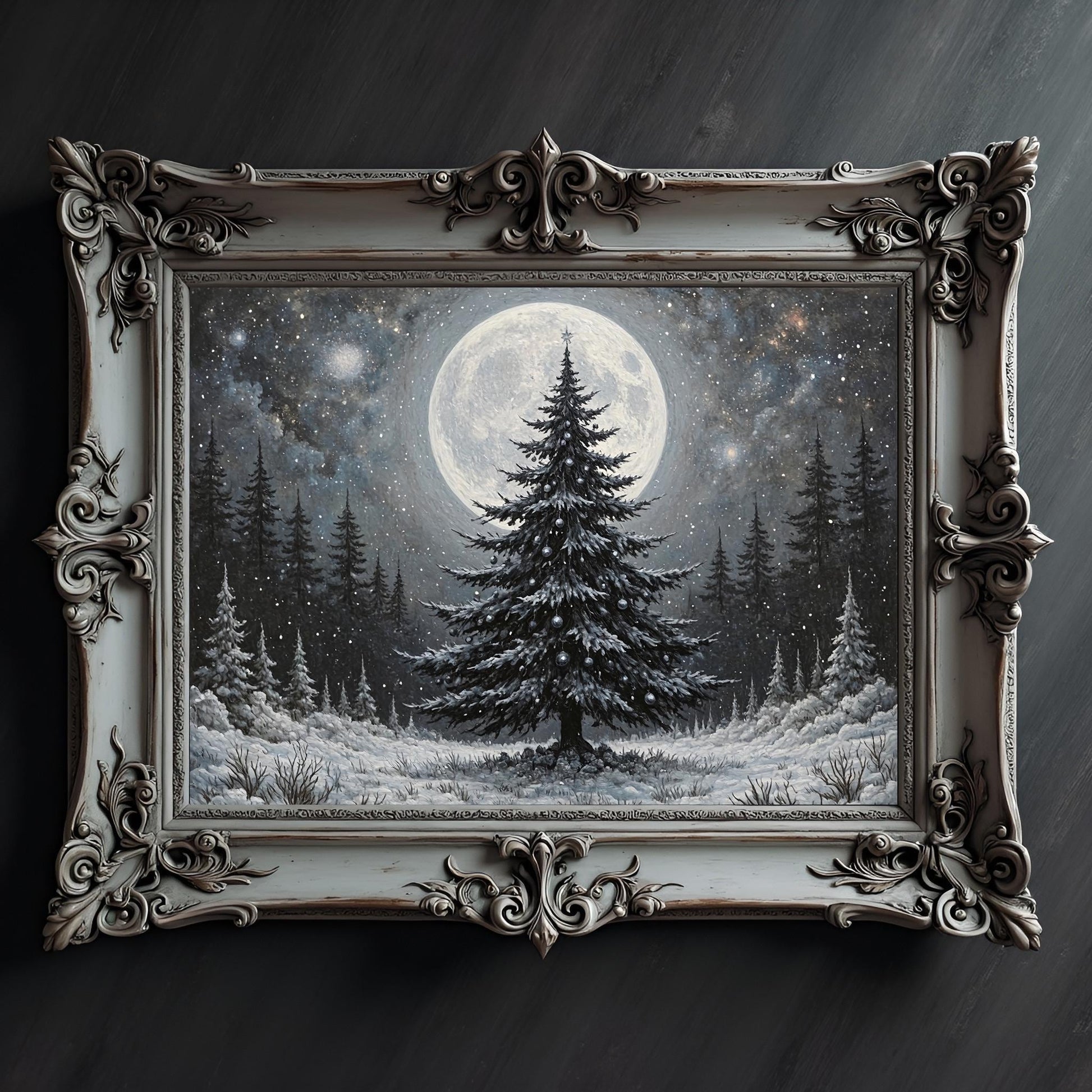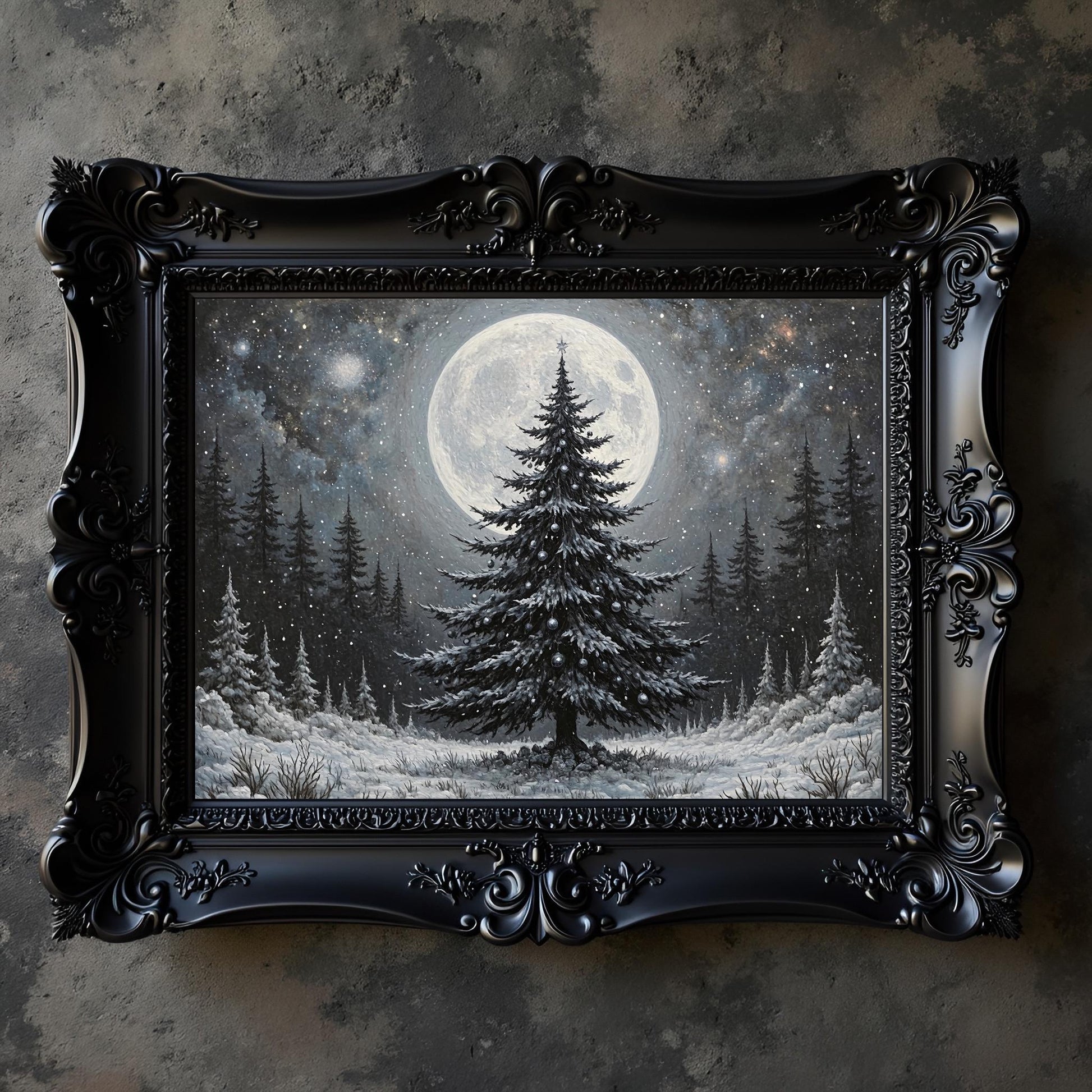 Gothic Christmas Tree Print: Yule Tree Under a Full Moon, Holiday Decor