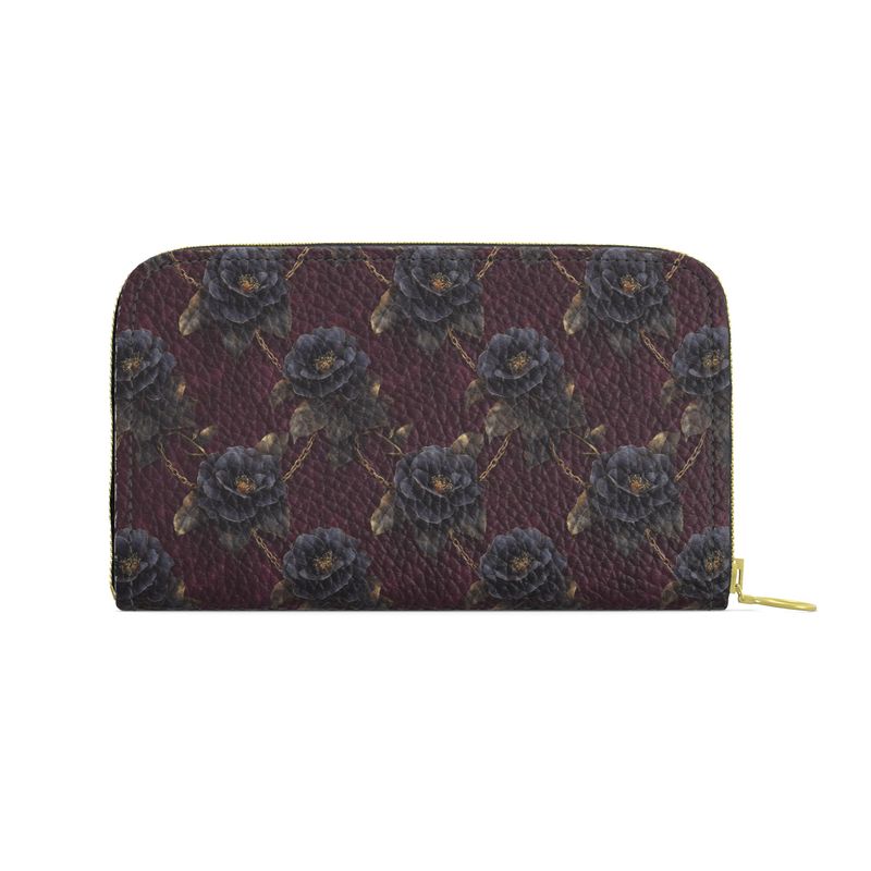 Full grain Nappa leather wallet showcasing a moody print with indigo flowers and gold chains on a deep aubergine background. This gorgeous wallet features two inner compartments and one inner zippered pouch. Matching handbag also available in my shop.