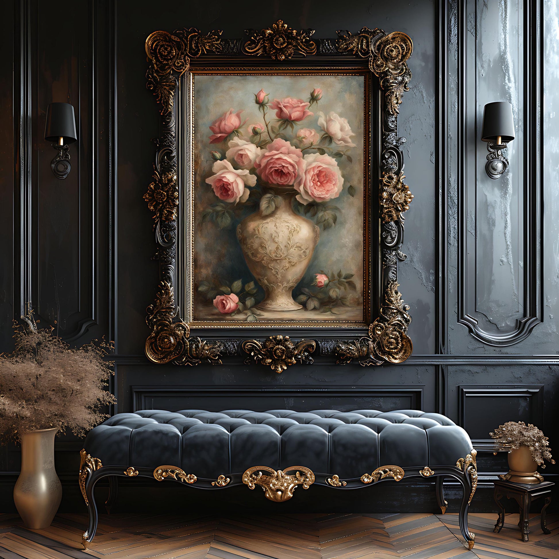 Pink Rose Still Life Art Print: Rococo Botanical Wall Hanging