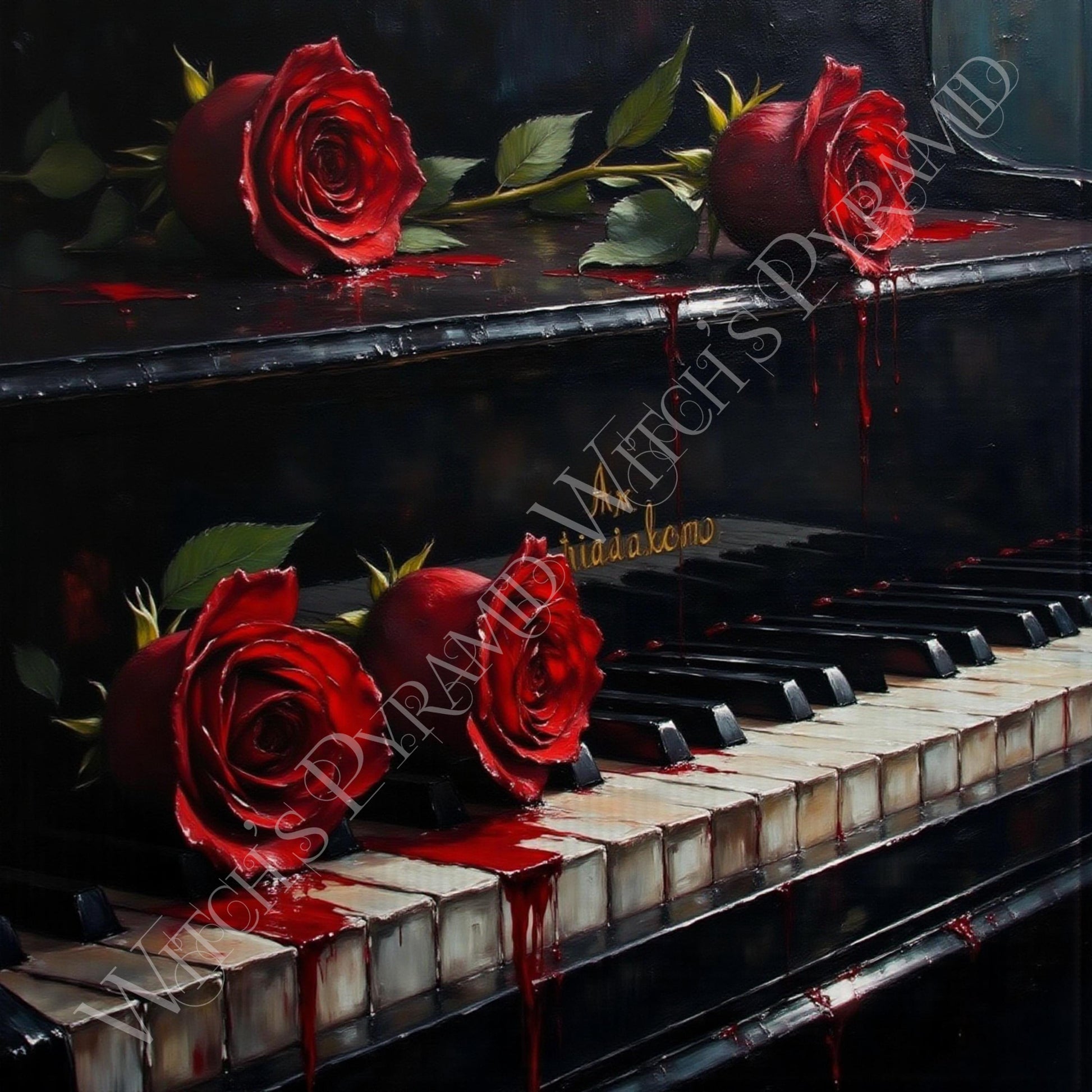 Red Roses on Piano Keys Art Print: Dark Academia Home Decor