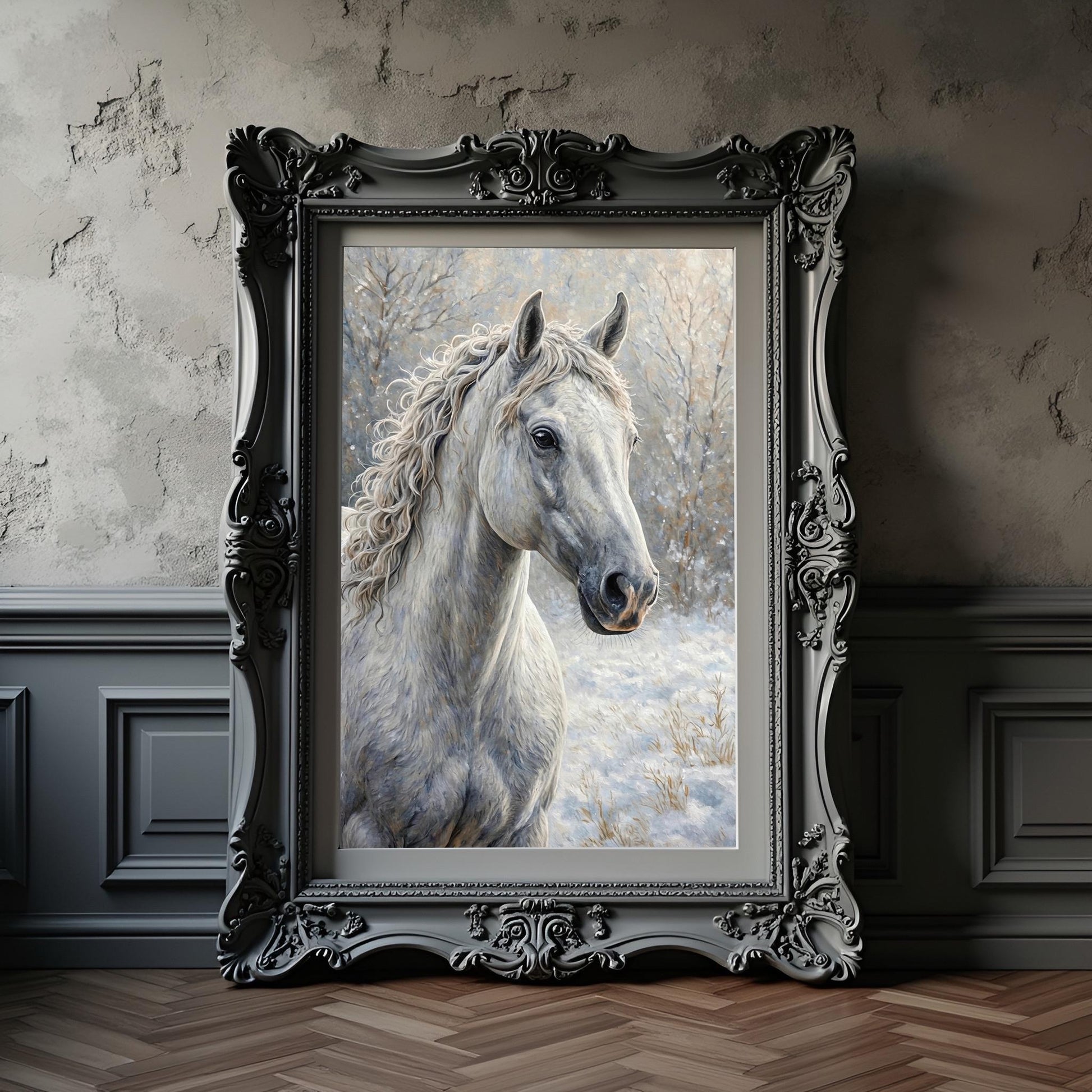 White Horse Portrait Art Print: Winter Snow Scene
