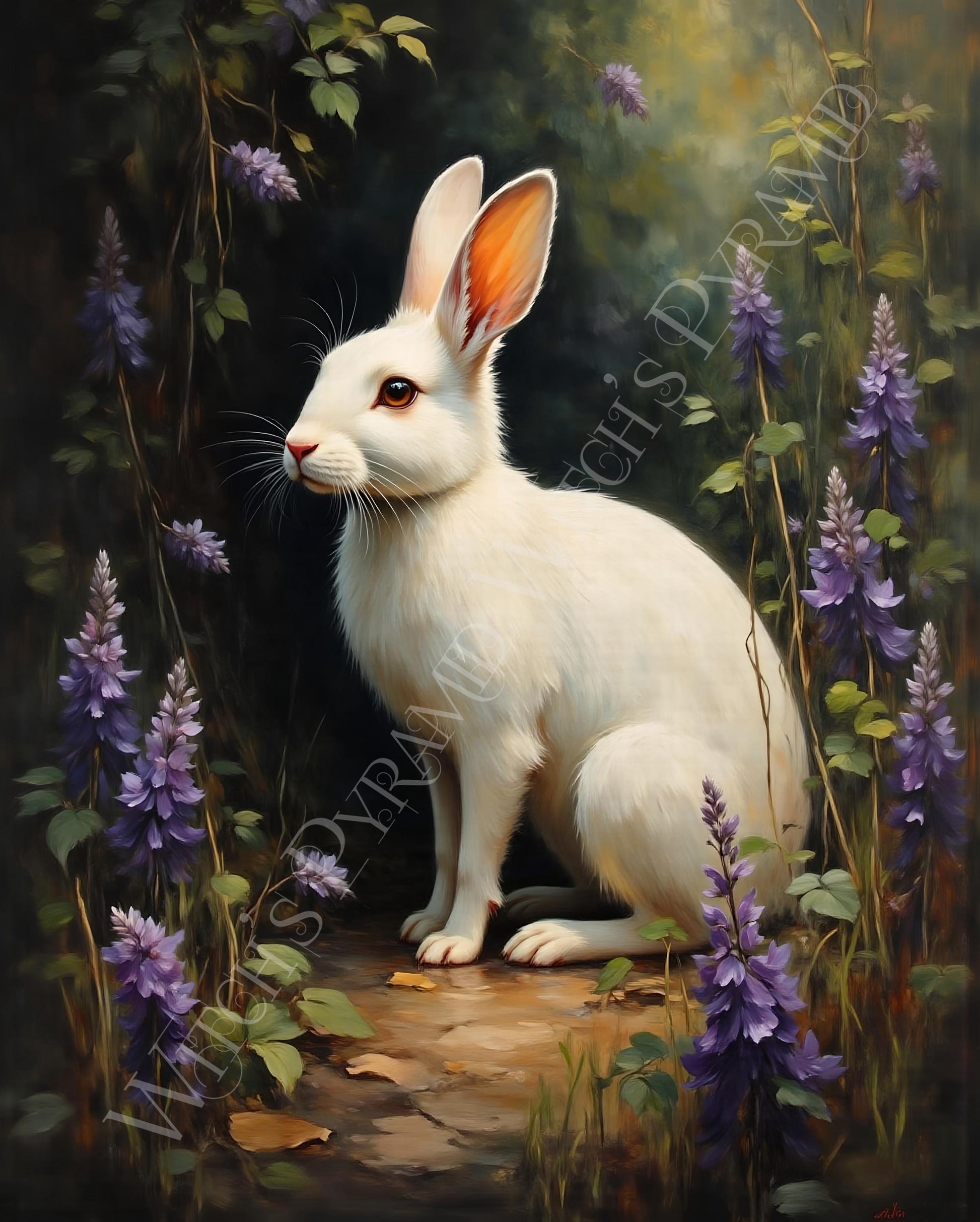 White Rabbit with Lavender Print: Dark Academia Bunny Wall Art