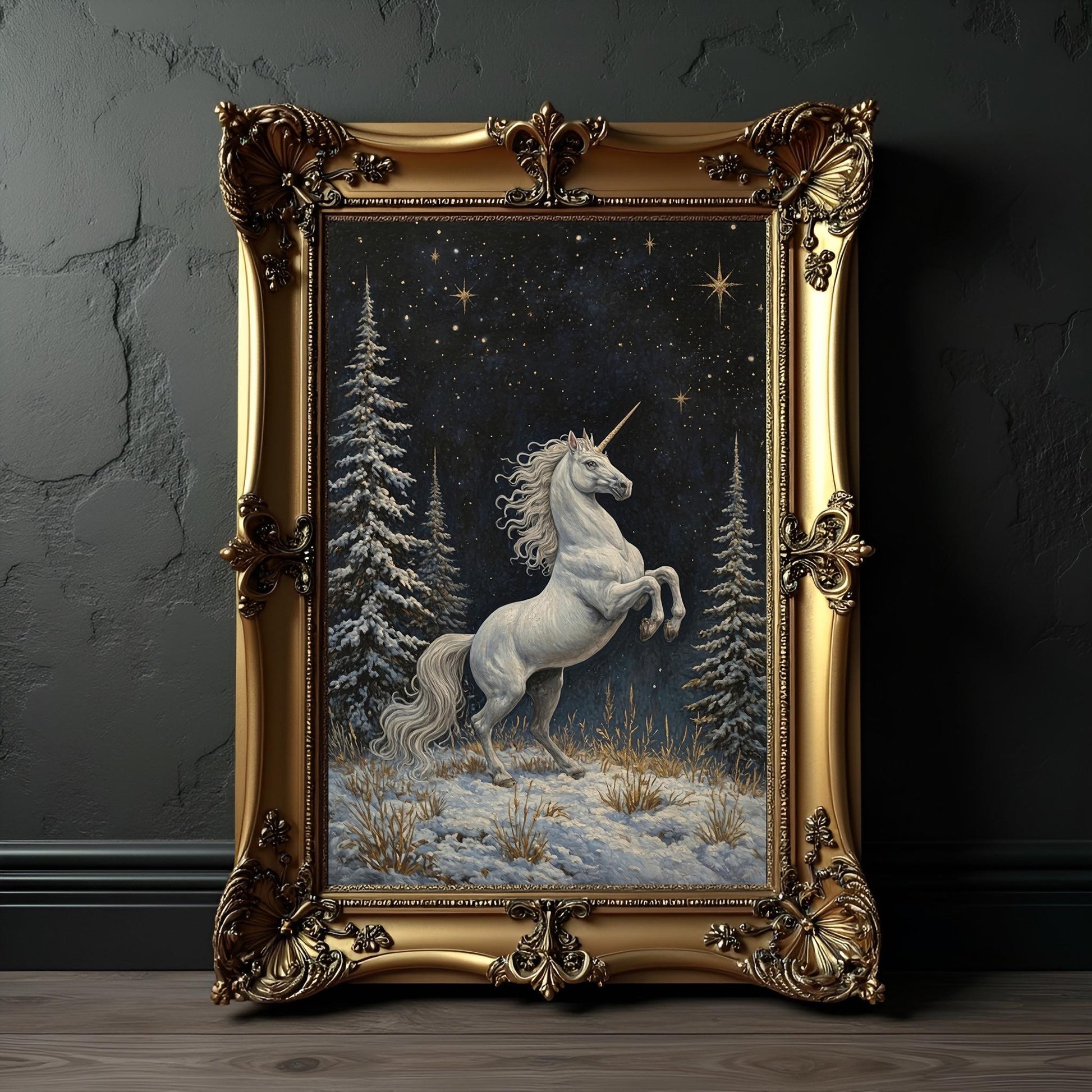 White Unicorn in a Snowy Pine Meadow Art Print: Winter Decor For Unicorn Lovers