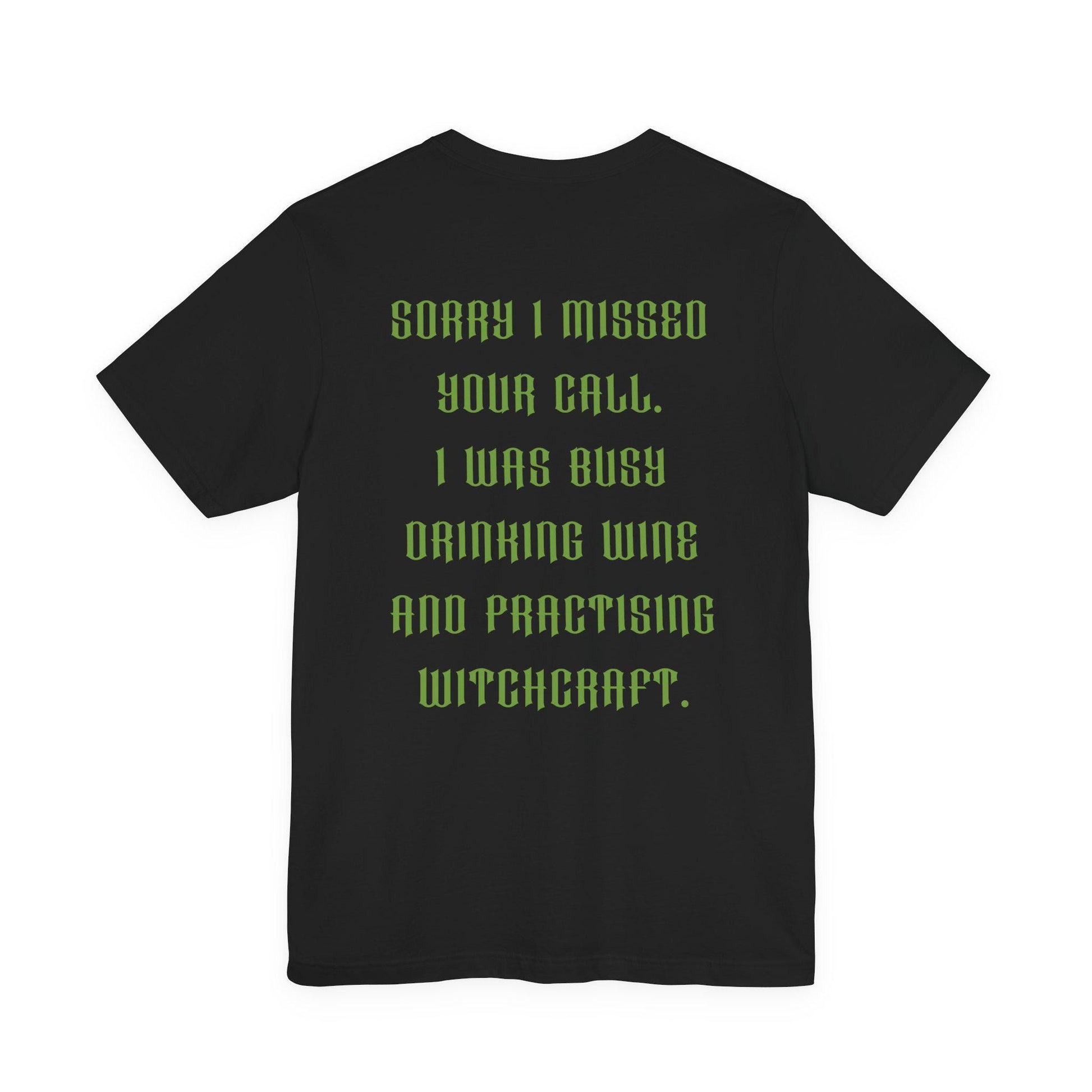Witch Drinking Wine Graphic T-Shirt Back of the shirt reads: Sorry I missed your call. I was busy drinking wine and practicing Witchcraft.