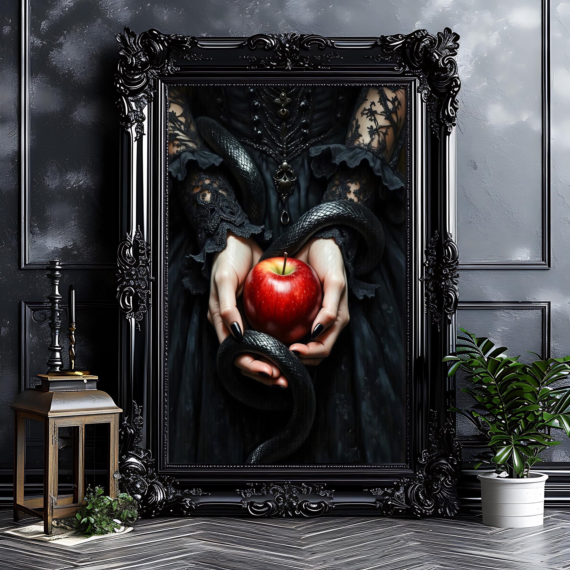 Giclee Print: Woman's hands wearing black holding an apple with a snake