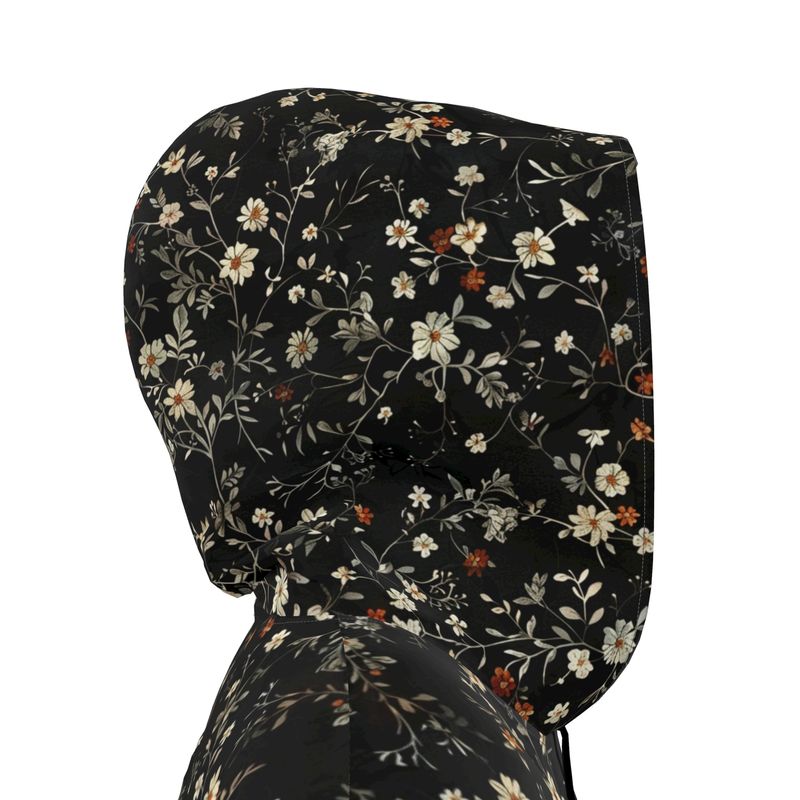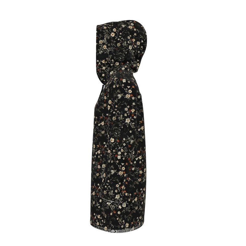 You will love this moody floral print rain jacket with its cute dainty flowers on a dark textured background. The jacket has ample hood space and side pockets. Choose from three fabric types to suit your climate and needs.